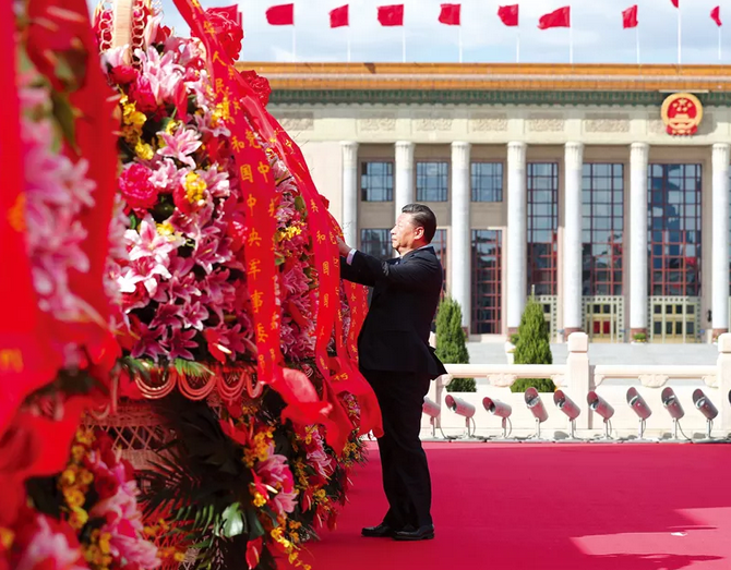 出席烈士紀念日向人民英雄敬獻花籃儀式。這是習近平整理花籃上的緞帶。新華社記者 謝環馳/攝