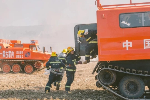 哈一機集團北方防務公司蟒式全地形雙節履帶森林消防車可運送大量消防人員和攜行裝備物資,解決山林地區徒步過程中的體力消耗問題,突破傷員轉移瓶頸。